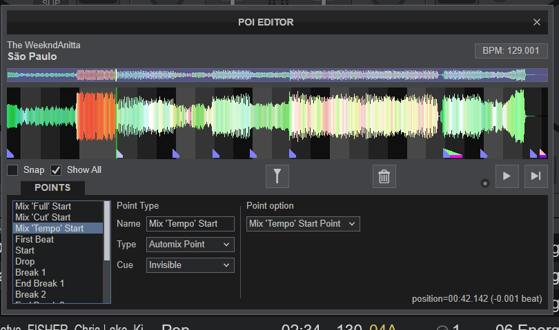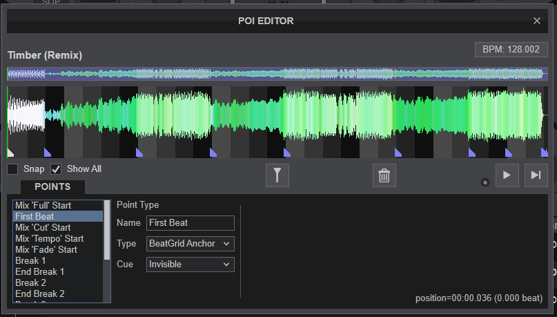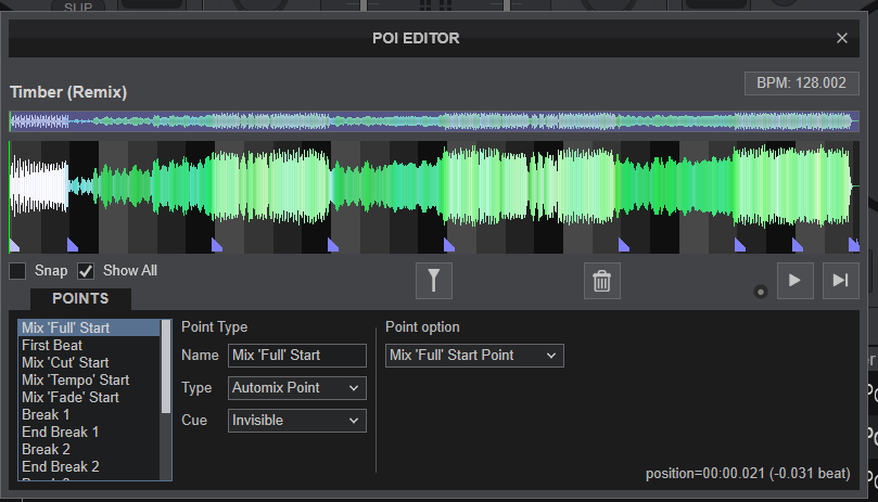 I am attaching screenshots of my POI Editor so you can see exactly how these points are named and what their types are. My goal is to automatically convert all these detected points into Hot Cues so I can trigger them from my controller pads.