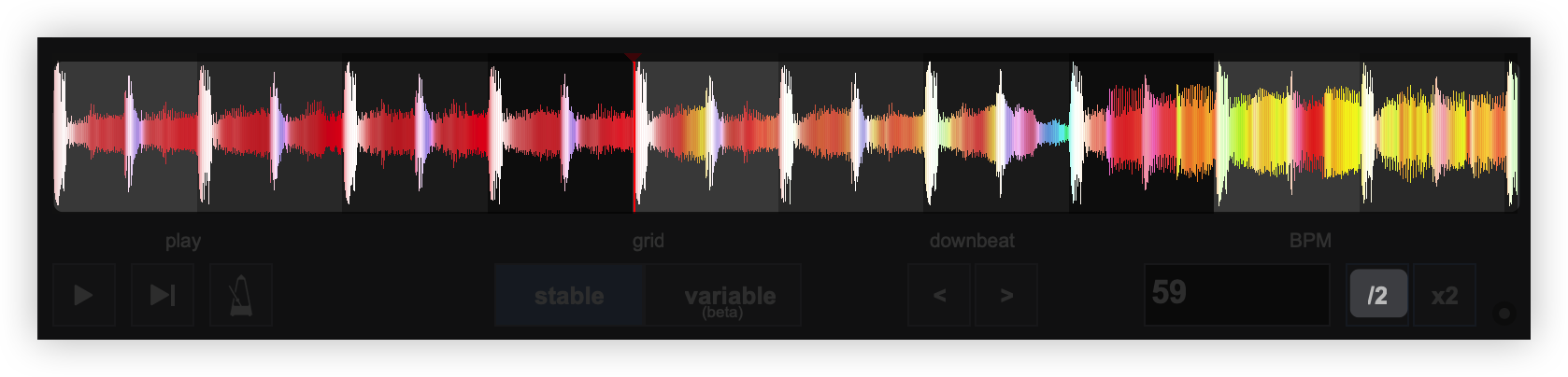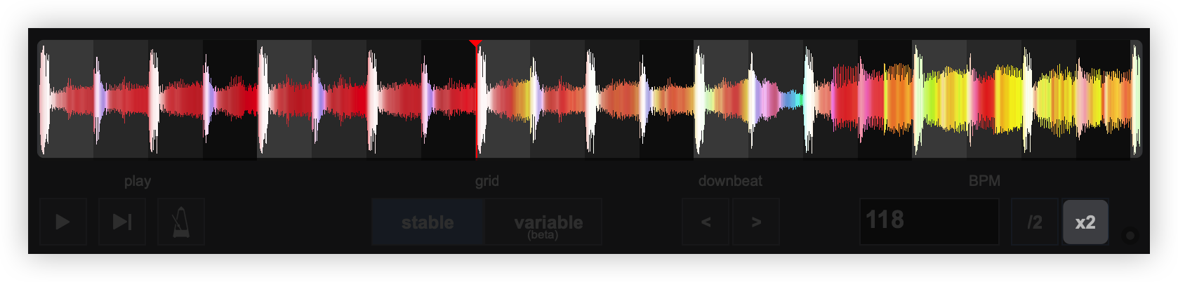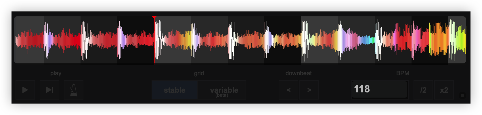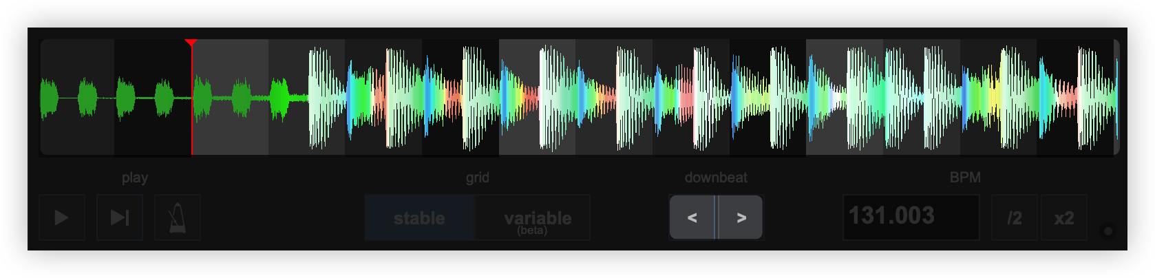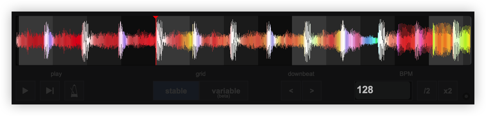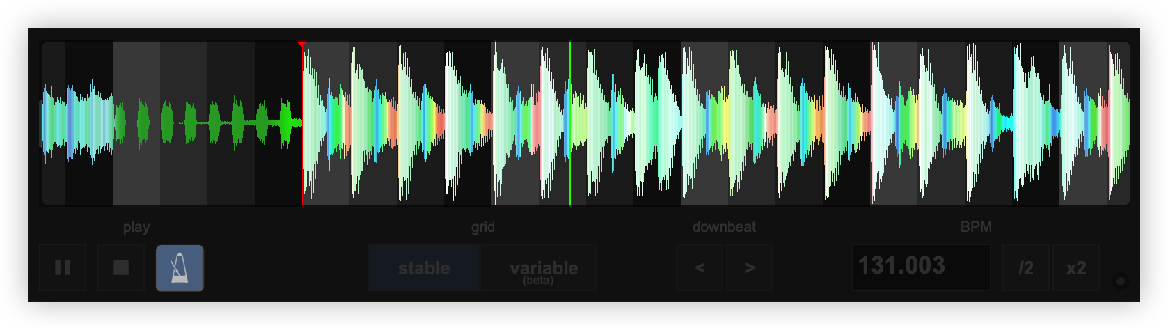 Once the BPM Editor is opened, the track will be analyzed and the multi-colored waveform will be displayed, providing information of its structure based on the detected frequencies. The grey-scaled background indicates the 4 beat pattern of the beatgrid of the track. The red vertical line indicates the Beatgrid anchor (first detected beat) if a Stable BPM is detected (default). If a Variable or Multi BPM is selected from the Grid Mode dropdown, multiple anchors will be displayed.
