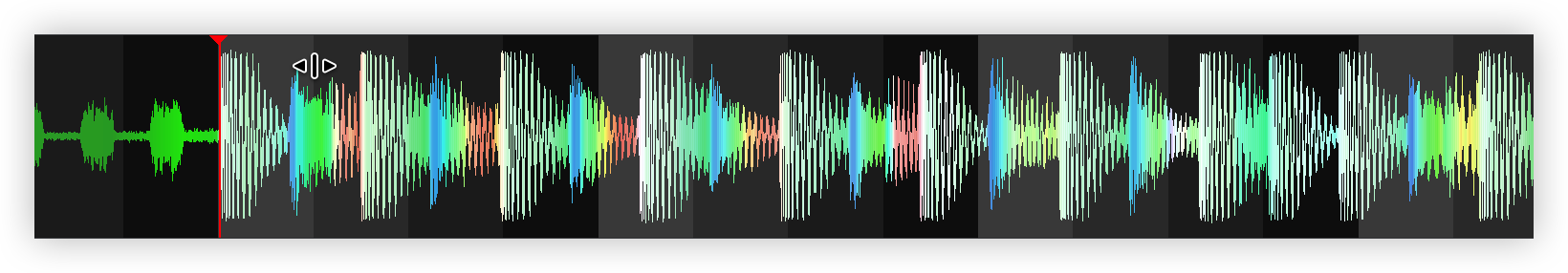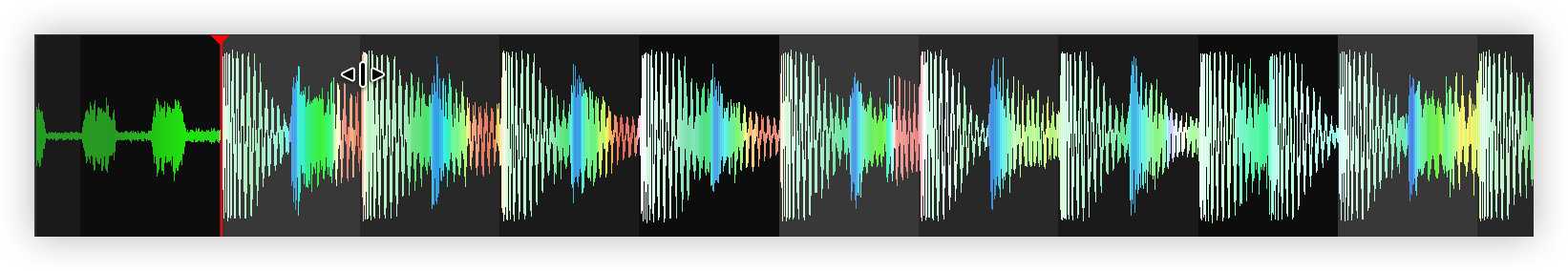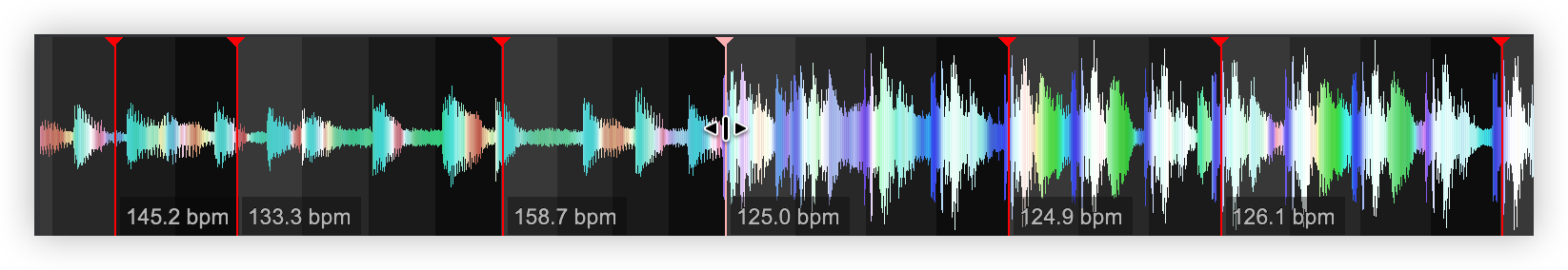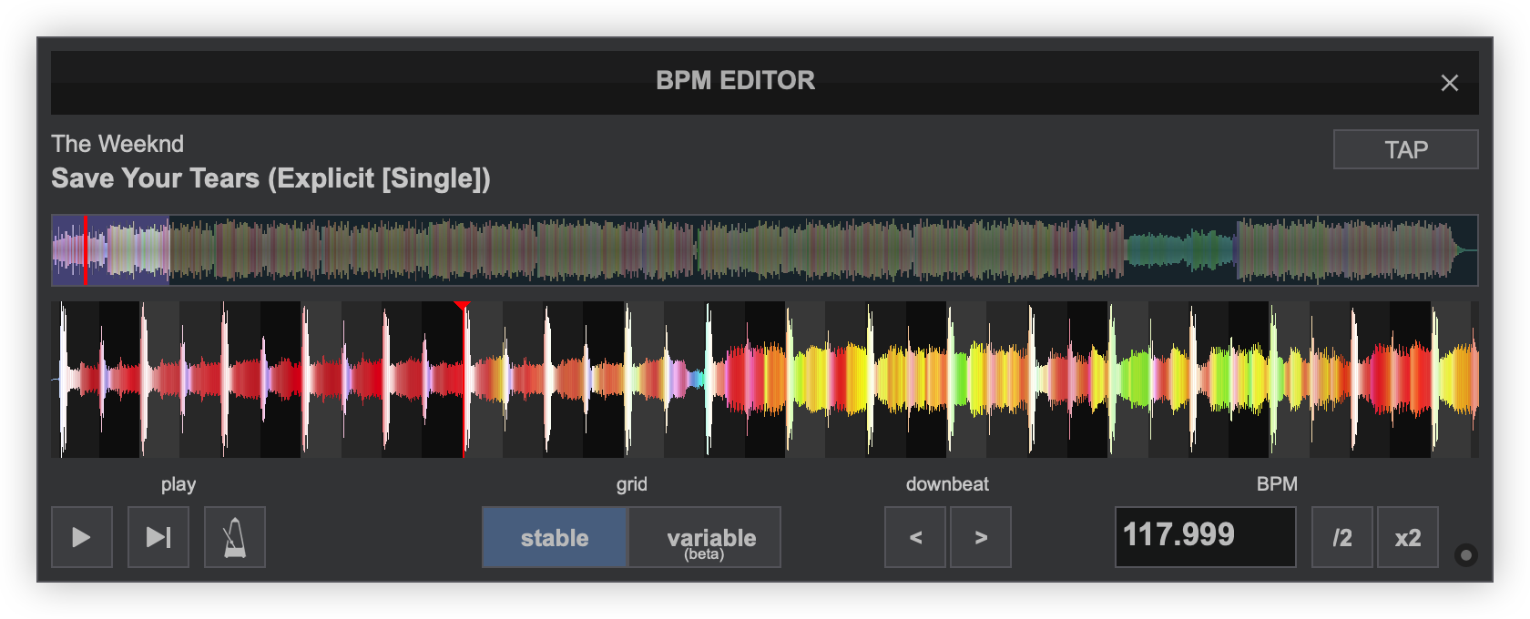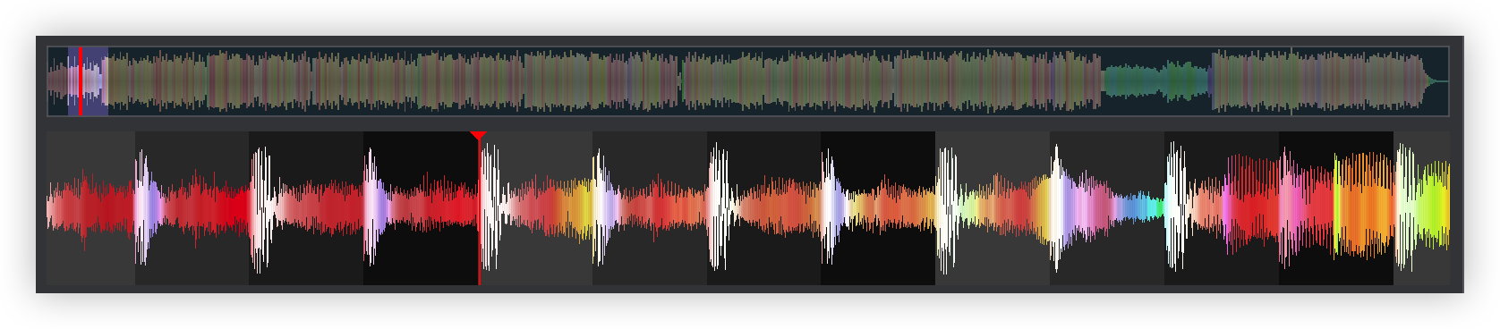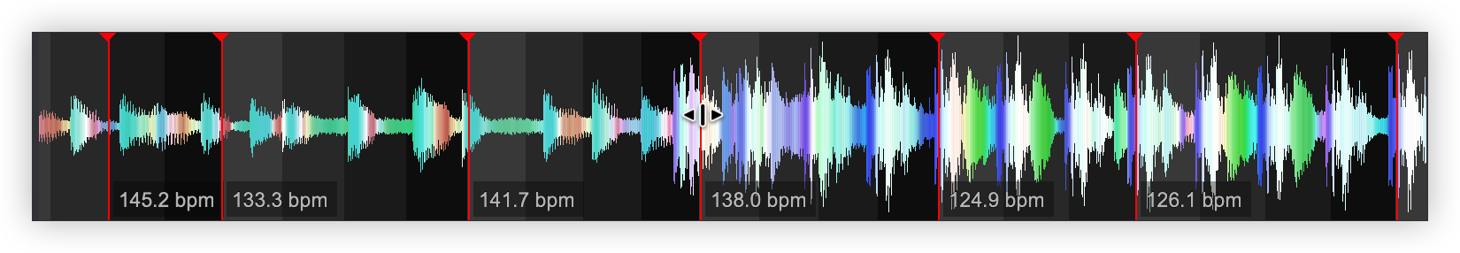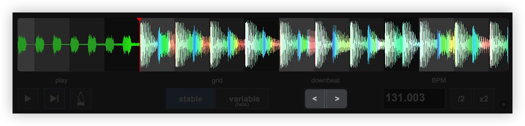 Once the BPM Editor is opened, the track will be analyzed and the multi-colored waveform will be displayed, providing information of its structure based on the detected frequencies. The grey-scaled background indicates the 4 beat pattern of the beatgrid of the track. The red vertical line indicates the Beatgrid anchor (first detected beat) if a Stable BPM is detected (default). If a Variable or Multi BPM is selected from the Grid Mode dropdown, multiple anchors will be displayed.