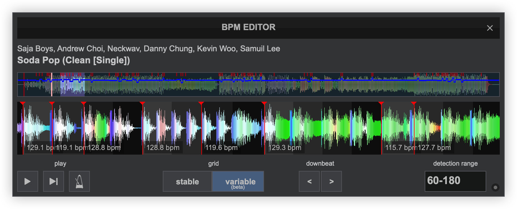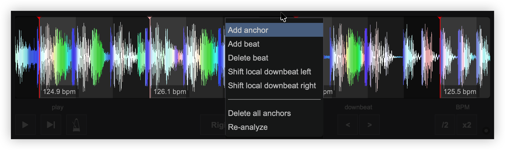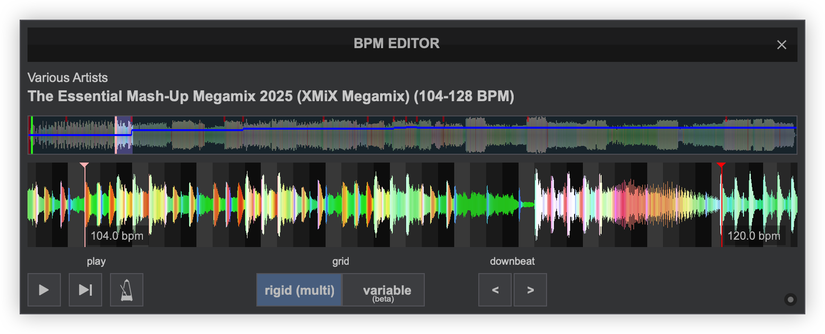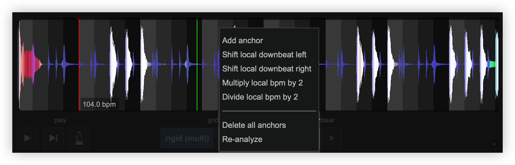 Once analyzed, it will display MULTI mode and add multiple beatgrid anchors automatically so that the CBG stays as accurate as possible. Each anchor will display the BPM value.