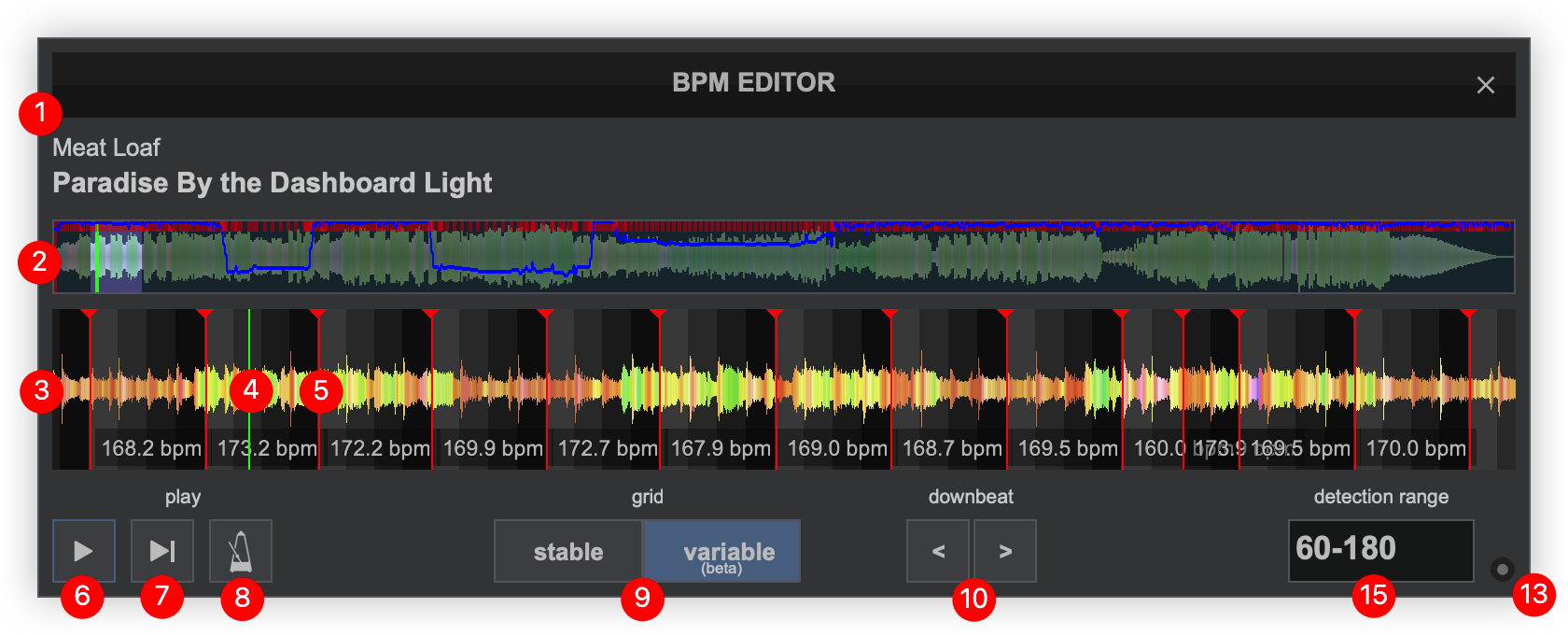 11. BPM VALUE (Stable BPM). Displays the currently adjusted BPM. Typing a BPM Value into the box will readjust the grid based on the value entered.